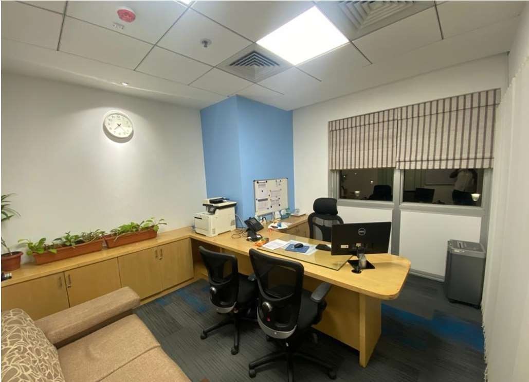 • Private Offices: A separate cabin is also shown, featuring a spacious wooden desk, a comfortable sofa, and a clean, minimalist design with a light blue accent wall. This provides a quiet, private space for management or focused tasks.