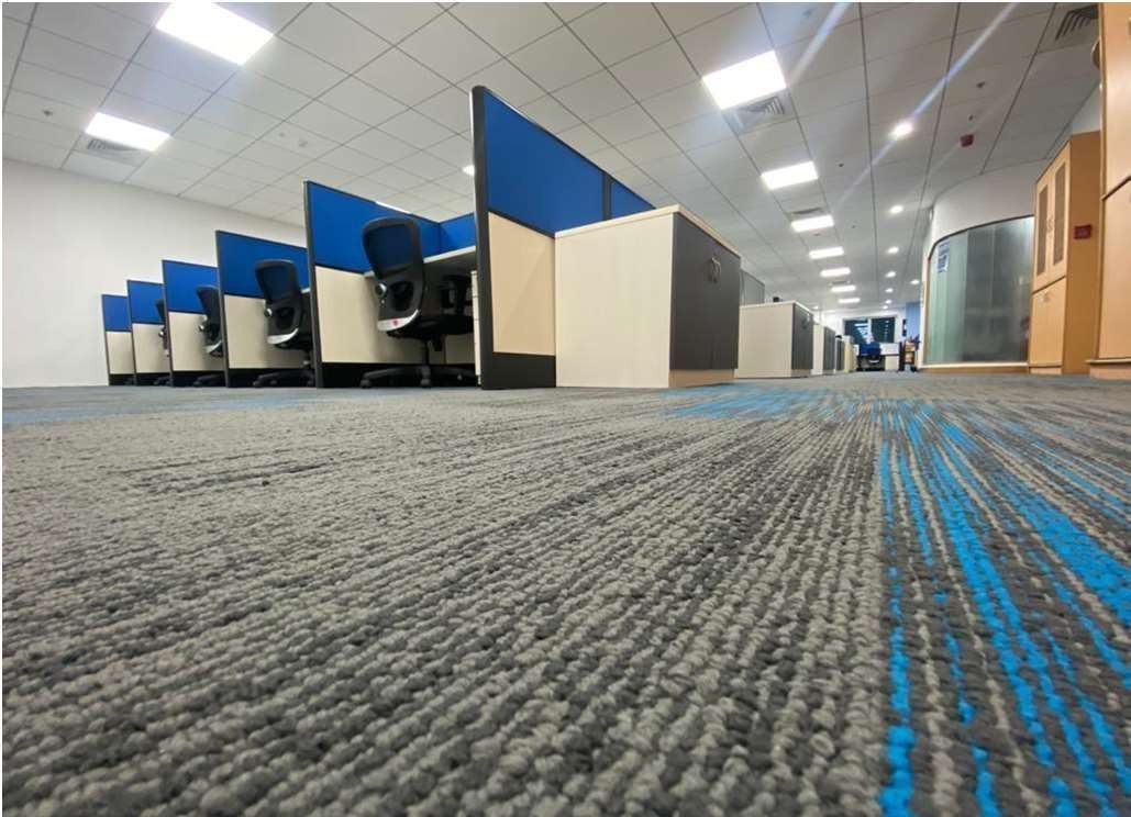• Color Palette: The primary color scheme is corporate and neutral, with white and light wood tones. This is accented by vibrant blue and grey panels on the cubicle dividers, adding a touch of color and visual distinction. The blue and grey carpet tiles complement this palette.